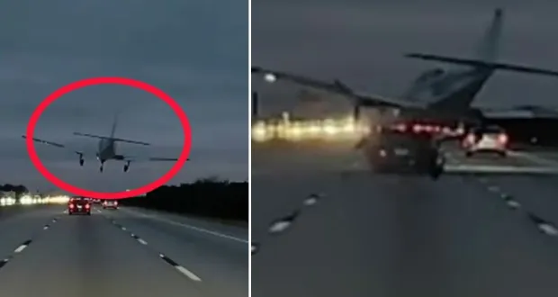 The compelling footage shows the plane descending rapidly, striking a vehicle on the highway, and then coming to a halt amid sparks and scattered debris. The dramatic visuals have sparked a flurry of social media reactions.